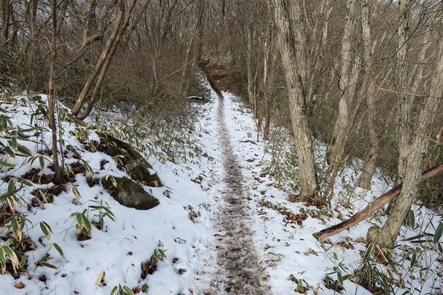 稜線へ出て山頂方向と進むと、日陰の平坦路でわずかに積雪が見られます。