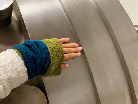 醜手でごめんなさい。成人女子の手の長さが約18センチx3の厚さのドアです。ルパン三世の世界かぁ…思っちゃいました。重い金庫を製造させたらNo.1の老舗メーカーとセキュリティ会社のの刻印があり、両社今でも存在してるってちょっと感動。