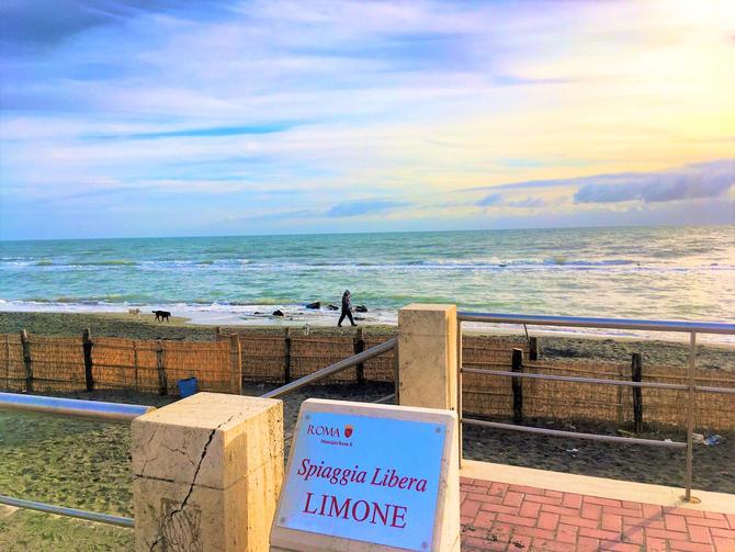 ↑ ローマの海は、ローマの中心部から電車や車で30分程でアクセスができます。こちらは、どなたでも自由に利用することのできる砂浜「レモン/Limone イタリア語でリモーネ」です。ゾーンによって、分かりやすい名前がついています。海辺を散歩中の3匹の犬が、楽しそうに飛び跳ねていました。