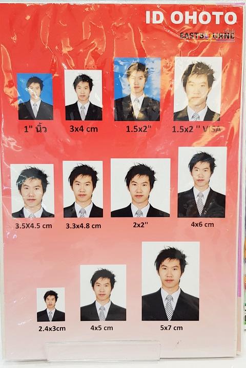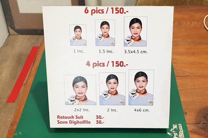 日本のパスポート用写真は6枚150B。フラッシュの使用がありませんので、解像度などはそれほどよくはないように感じますが、自然な表情で、シミとシワが気になる私にはちょうどいい仕上がりになります。必要な証明写真のサイズがあり、必要枚数が6枚以下だけでよい場合、今回紹介する3店舗中、証明写真は現時点でここが一番お得だと思います。今回、日本のパスポート用の写真をここで撮影してもらったものを使いましたが、問題なさそうです。また、夜21時まで営業しており、混雑していなければ、撮影後受取まで約15分で済むのもありがたいと感じています。ただし、スタッフがひとりだけしかおらず、過去には休憩でいないことがありましたので、その点ご了承ください。