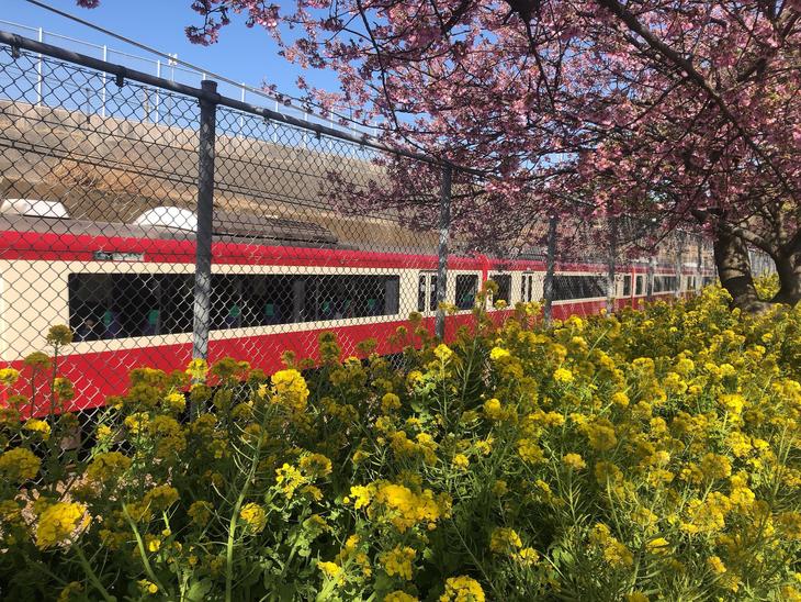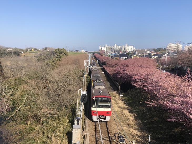京急電車と桜のコラボレーションが美しく、多くの人がシャッターを切っていました。