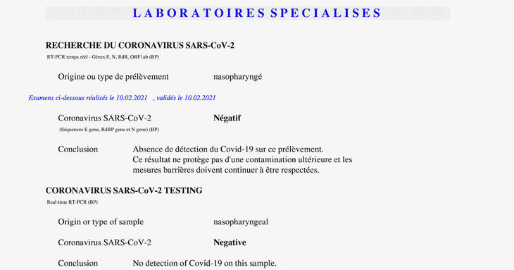 検査結果がフランス語と英語で表示されます。「Négatif」の文字があれば陰性です。