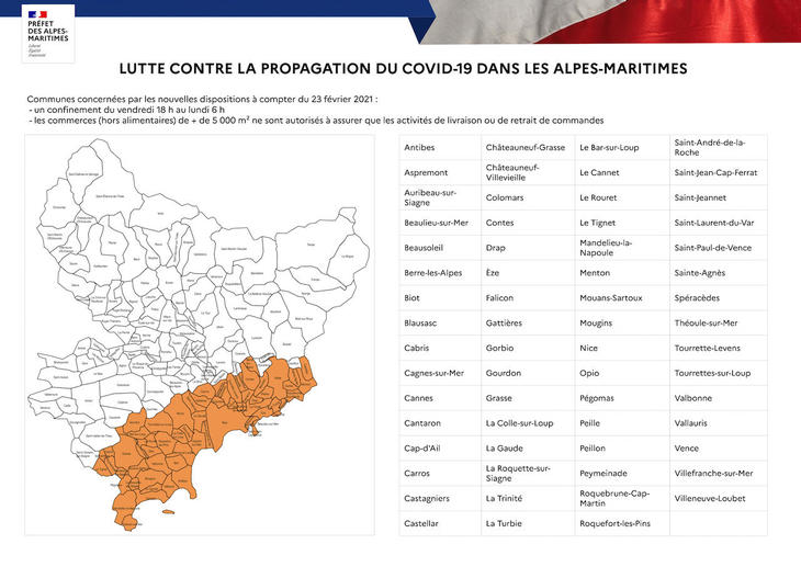 新型コロナウイルスの感染拡大がより顕著となってきた南仏アルプ・マリティム県では、同県の一部地域で今週と来週の週末(2021年2月26日18:00~3月1日6:00および3月5日18:00~8日6:00)に、外出制限(ロックダウン)が敷かれます。