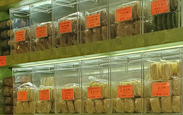 値段はだいだいひとつ6~10ドルくらいで、最低ふたつ以上買うというのが基本です。食べ方はいろいろですが、個人的にはゆでて、オイスターソースをかけて食べるというのが、一番シンプルかつ麺の味をそのまま感じることのできる食べた方だと思っています。
