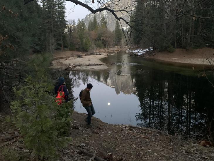 ファイヤーフォール終了後は、みんなやや興奮気味で、まるで花火大会のあとのようにゾロゾロと帰っていきます。ノースサイドドライブの2車線のうち1車線は歩行者・バイク用、車は1車線のみとなり若干渋滞。脇を流れるマーセッド川(Merced River)沿いを歩いて車に戻りましたが、静かな川面に月が映る。