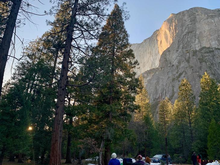 木曜日夕方、エル・キャピタン周辺の駐車スペースを確保。ファイヤーホールが見える期間は、平日でも混雑していています。パーキングの規制(専用駐車場は予約)もあり、安全に停められるところを探さなければなりません。この日は、日中の気温13~15度くらいで春の陽気を思わせるようないい天気。しかし、日没直前から一気に気温は下がります。