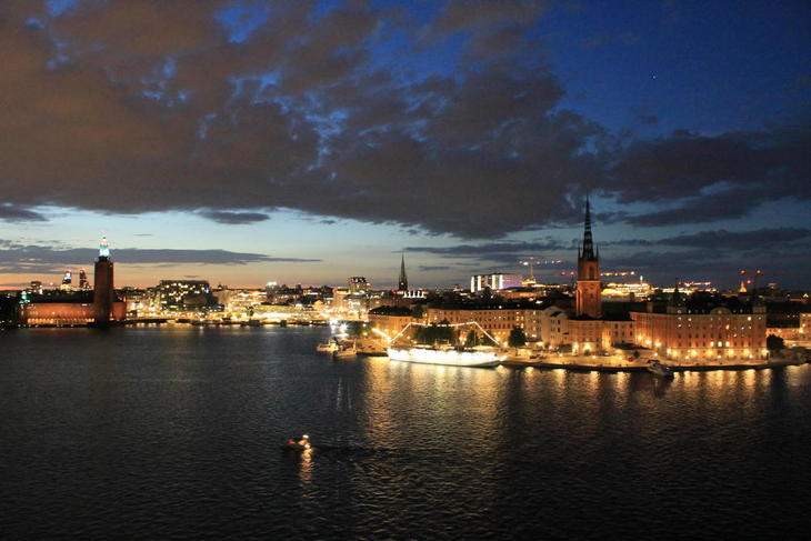 崖の上にある遊歩道ですが、右方向から順に、遠くにはアミューズメントパークGröna Lund(グレーナルンド)があるユールゴーデン、そしてメラーレン湖に浮かぶようにしてガムラスタン、ストックホルム市街、ストックホルム市庁舎、そして左にはストックホルム最長のVästerbron(ベステルブローン)橋が見えます。