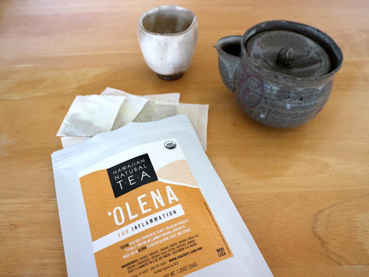 「オレナ」はハワイ語で「ウコン」のことを指します。オレナは、古代ポリネシア人がカヌーでハワイにやってきたときに持ち込んだカヌープラントのひとつです。「オレナ」にもハワイ産のママキとモリンガを使用し、そのほかにはオーガニックのウコン、ジンジャー、グリーンティー、レモングラス、ブラックペッパーを使用。ウコンは痛みや腫れを和らげる効果があると言われ、日本では昔から二日酔い予防に使われていますね。
