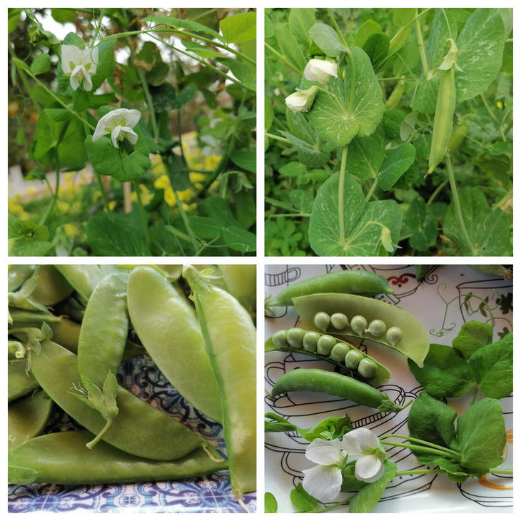 写真は左の上がエンドウ豆の花。右上が絹さやの花とエンドウ豆のように太った絹さや。