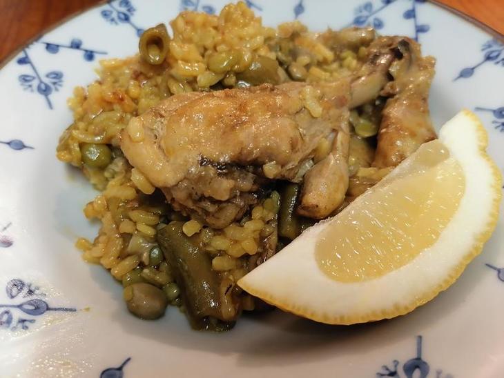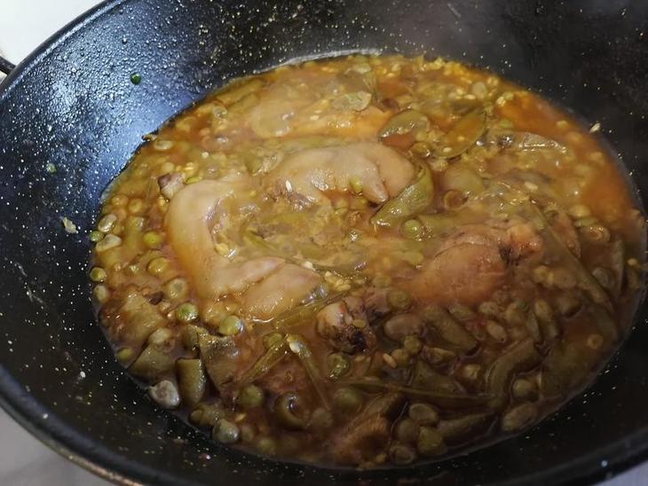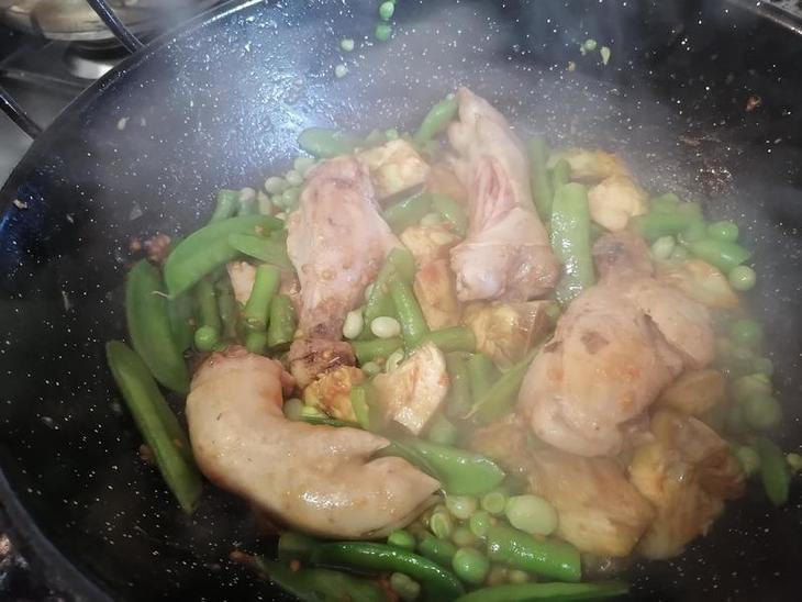 今日はベイビーソラマメと、若いさやごとのソラマメと、アーティチョークを使って「バレンシアの冬のパエリア」を作りました。採れたての絹さやも入れました。お肉は冷凍庫に眠っていた骨付きチキンと豚足です。