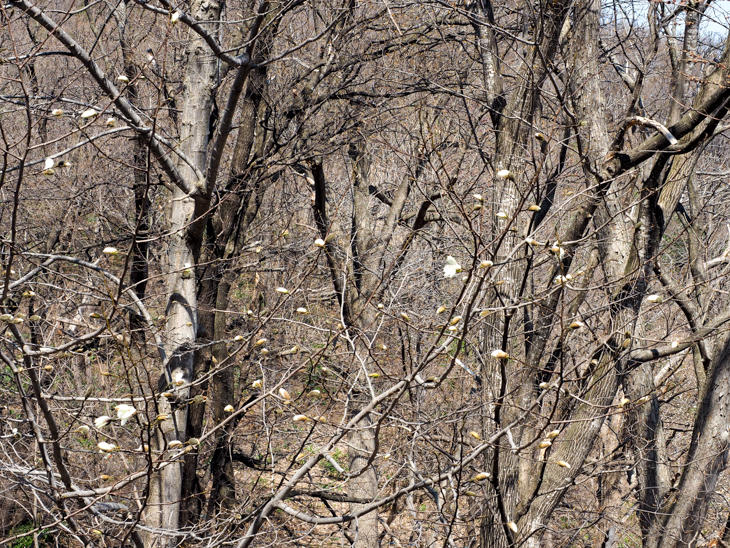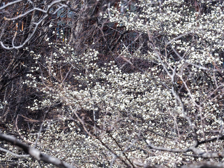 雪も緑もない茶色い山肌にそこだけ白いキタコブシが咲いているようすもきれいです。
