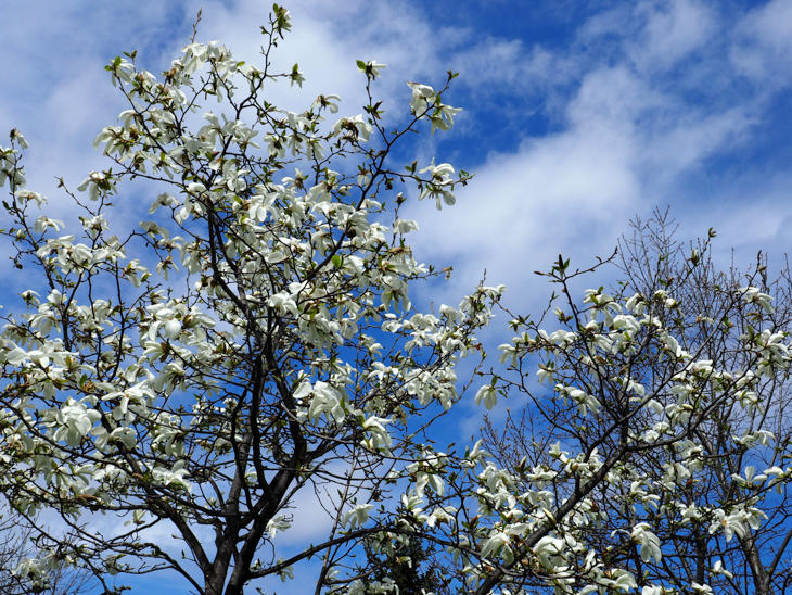 この時期、周りの木々はまだ裸の枝ばかりで、薄茶色の中に真っ白いキタコブシが光るように咲いています。