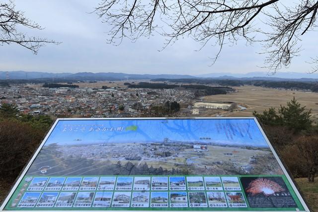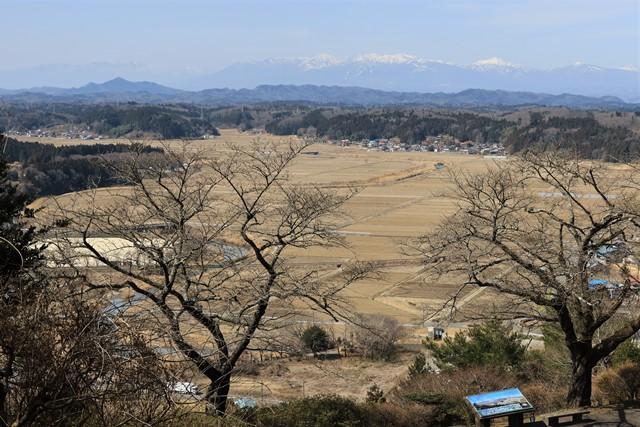 本丸跡の一角より、那須連峰をバックに浅川町内の田園風景