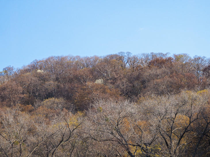 山の木々はまだ新緑が見られず、常緑樹もないので、山全体がほんのりオレンジ色に見える春紅葉です。