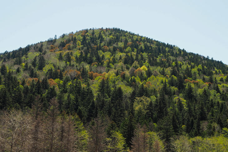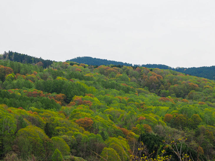 高速道路を走っていると、山が連なっている光景が多いのですが、札幌より北の山間部では、緑の若葉と春紅葉のコントラストがくっきりと見えました。