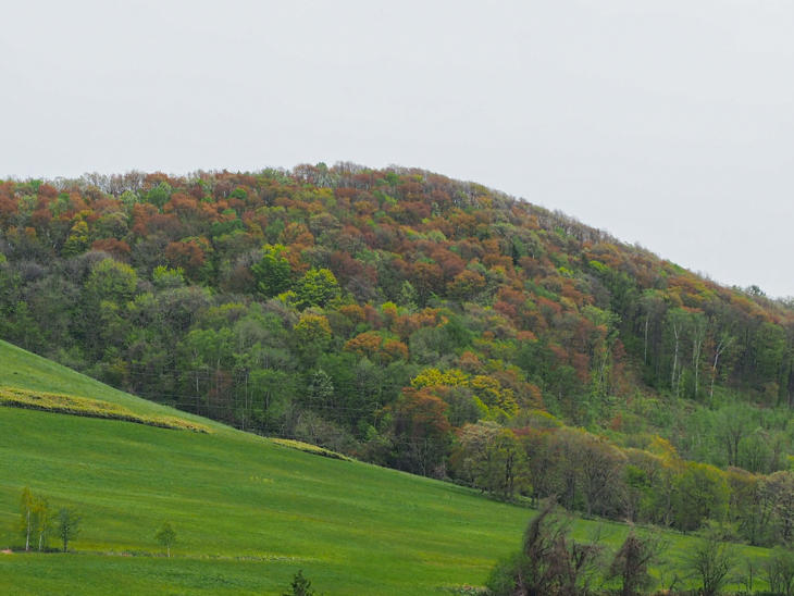 一見すると、まるで秋の紅葉のような色合いですが、濃いピンク色のエゾヤマザクラが春を知らせてくれる風景です。