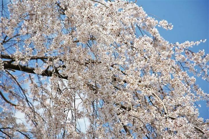枝垂れ桜の中に入って上を見上げると、まるで桜のシャワーの中にいるようです。