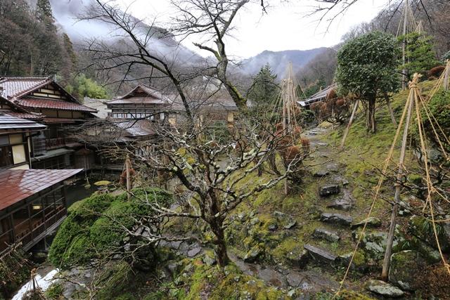 小雨に濡れる内庭の先には、山霧が漂う美しい情景が広がっています。