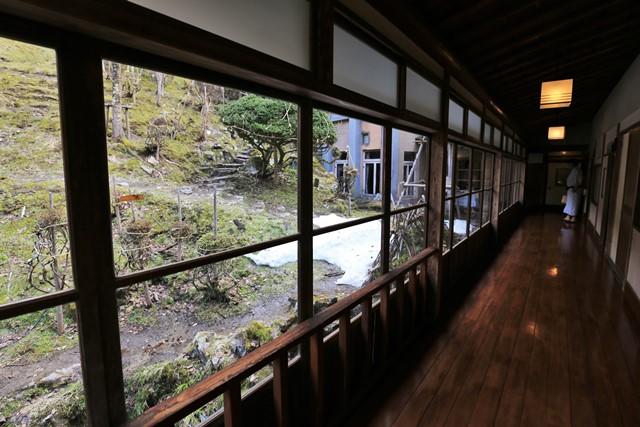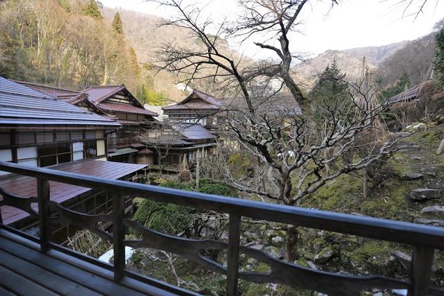宿泊部屋より、手摺越しに望む中庭と背あぶり山方向