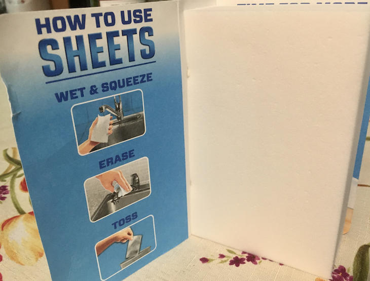 「ミスタークリーン マジックイレイサー シートタイプMagic Eraser Sheets」は、スポンジでは使いにくい細かいところや狭いところ、平らな面などの汚れを、布巾(あるいは雑巾)のように水で濡らして使い、使い終わったらポイッと捨てるもの。