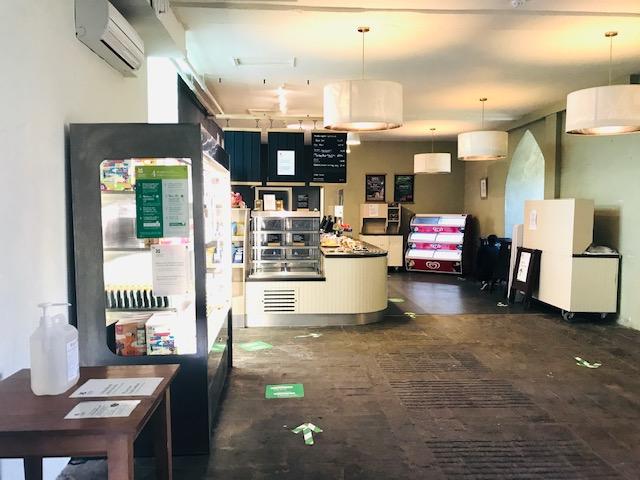 中庭にはショップとカフェが併設されていますが、現在ショップは休業中。カフェは店内の飲食スペースが撤去され、テイクアウト商品のみの販売となっています。