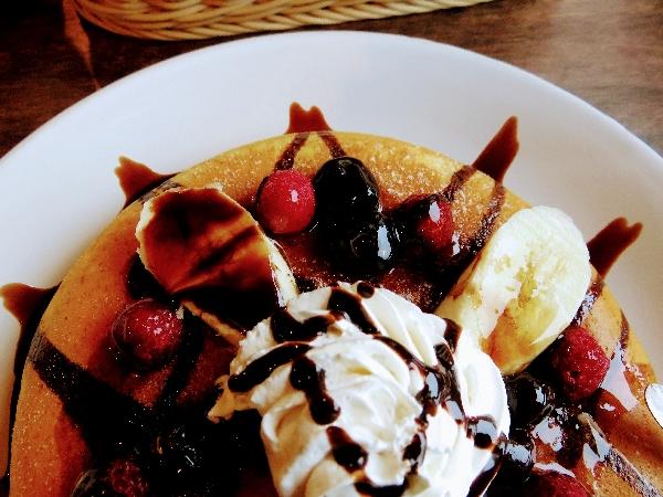 デザートパンケーキは、5種類のトッピング(フルーツミックス、リンゴ、ブルーベリー、バナナ&ナッツ、チョコレートチップ)の中からフルーツミックスをチョイスして念願のパンケーキを食べられることに気持ち高まり過ぎてウッカリ2枚重ねとか贅沢にもオーダーしちゃったわ(笑)