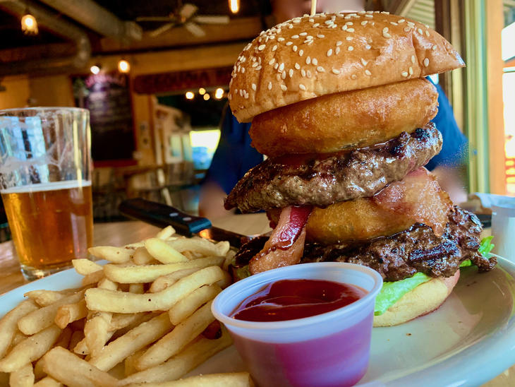 その名も"ビッグダディー、テキサスに行く"(Big Daddy Goes to TEXAS $15.79)テキサスに引っ越した人が、「テキサスってなんでも大きい」と驚いていて、またテキサス州は、それを誇りに思っているそうですが、まさに超巨大なバーガーでした。焼き具合を聞いてくれましたが、完璧に希望通り!半分に切るには手で優しくふわふわバンズを抑え、ゆっくりナイフを入れていく。