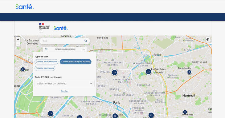 病院や検査機関の政府ポータルサイト「Santé.fr(https://www.sante.fr/cf/carte-depistage-covid.html)」から、新型コロナウイルス検診に対応している最寄りの医院やラボを、自宅住所を入力して調べることができます。フランス政府が推奨するスマホアプリ「TousAntiCovid」内からも検索ができます。