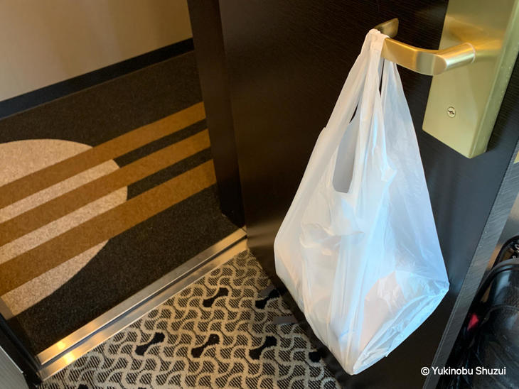食事は一律で、時間になると部屋の外のドアノブに袋に入れられてさげられています。館内放送が流れたあとに、マスクを着用のうえ、部屋のドアを開けて食事を回収します。食事には毎回アレルギー表示のメモが添えられています。またアレルギーの有無は、空港到着時の検疫でその旨を聞かれていました。