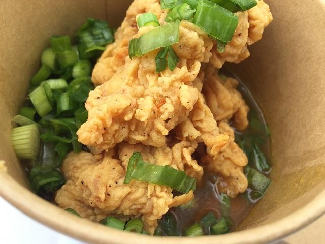蓋を開けると……かなり大きなフライドチキンが2個、どーん! テイクアウト容器が縦長のせいもあり、この時点ではうどんの姿が見えません。笑
