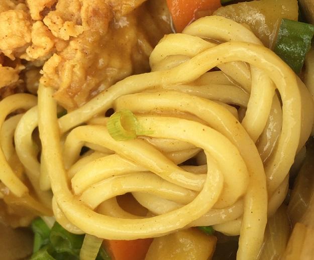 チキンをどかしたら、うどんとカレー汁が見えてきました。コシのあるおいしいうどんに和風カレーの濃厚おつゆ、満足感のある一品です。