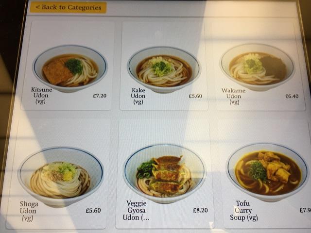 どれもおいしそうで悩んだすえ、チキンカレーうどん(£8.20)をチョイス。