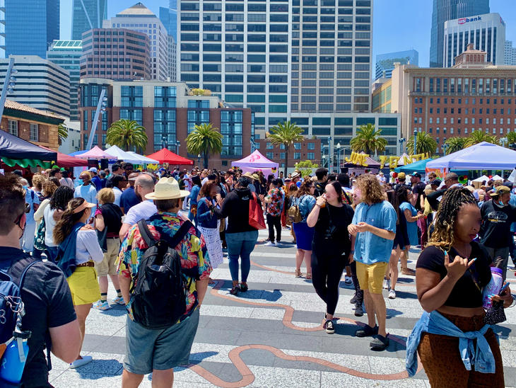土曜日朝7:30フェリープラザ南側ウォーターフロント広場で、メガブラックSF(こちら)主催の『ジューンティーンス(Juneteenth)』のイベントの準備が行われていました。17日に決まったアメリカの新しい祝日のお祝いです。