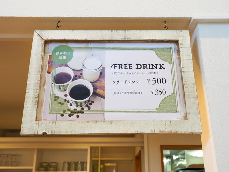 このほか500円(食事をオーダーの場合は350円)で「飲むヨーグルト」を含む、フリードリンクメニューもあります。