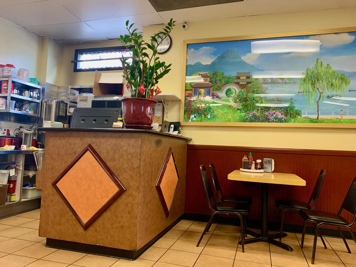 シビックセンターのファーマーズマーケットの帰り、ようやく店内飲食(Dine-in)が復活したベトナム料理(ベトナム麺屋さん)店の「HO2000」に行こうと思い、ラーキン通りを歩いていたら目の前に、3人のサンダルばきでくわえタバコのお兄ちゃんたちが、何やらしゃべりながら「Hai Ky Mi Gia/Chinese Cuisine麺家・海記」に入っていきました。この店、食べに来るお客の7割が男性でPHO2000のような女子ウケはしないよう。店の入口には、"OPEN FOR TAKE-OUT"と書いてありますが、お兄ちゃんたちは入っていきました。後にくっついていったら、店内で飲食可能だったんです。端っこのテーブルを案内され、コロナ前と変わらずメニューをポッと置いていき、少し薄い烏龍茶が出てきました。