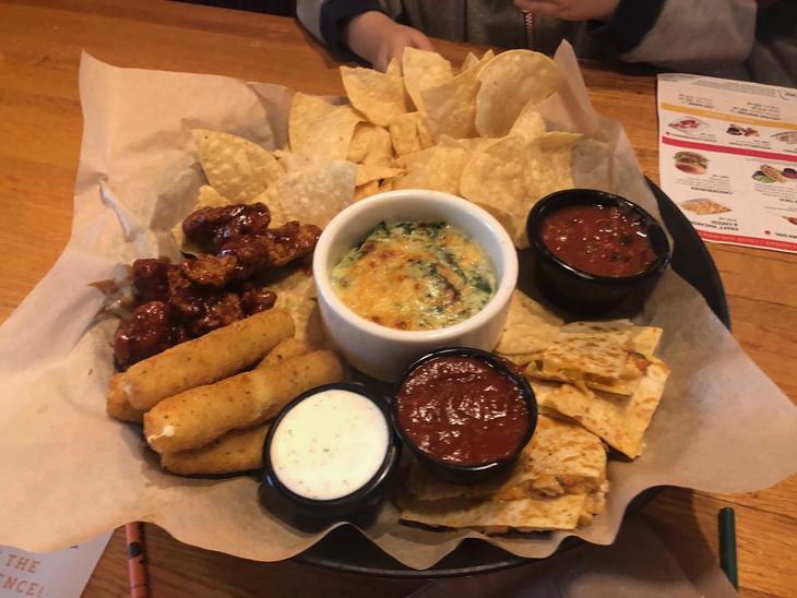 メニューは「これぞアメリカ!」という感じのバーガーやサラダ、チーズスティックなどの揚げ物やメキシコ系のチップスやケサディーヤ(チーズや鶏肉を生地に挟んで焼いたもの)などです。
