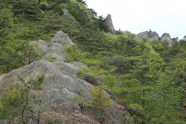 途中、矢2の展望スポットより屛風岩周辺の奇岩群を見上げます。