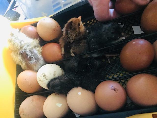 現在、家の中には先週生まれたバンタムのヒヨコたちがいますが、インキュベーター内にも来週誕生予定のアヒルの卵と産み落とされたばかりのキジとクジャクの卵が入っています。