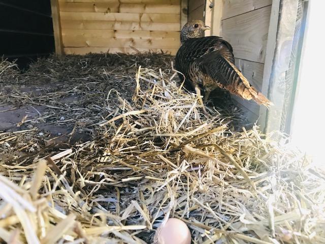 ▲ キジ小屋内部の様子。雌キジと2021年最初の卵(5月2日撮影)