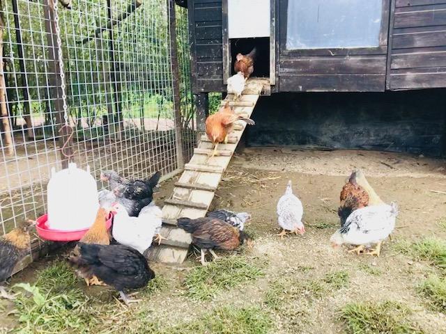 キツネや鷹、鷲などに襲われないようある程度の大きさになるまでは囲いの中で飼育しますが、夏にはほかのニワトリたちと一緒に庭を歩きまわることができそうです。