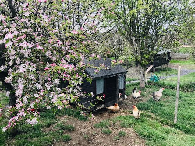 ▲ 満開のりんごの花とわが家のニワトリたち(ナンキン:茶色 / チャボ:白黒)