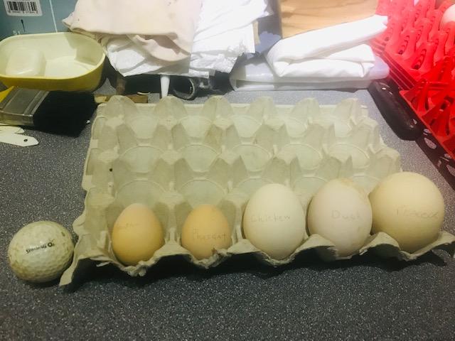▲ 卵の大きさ比べ。左からゴルフボール、バンタム、キジ、チキン、アヒル、クジャクの順