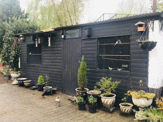 ▲ カナリアとインコの飼育小屋には野鳥用のバードフィーダー(餌台)をいくつも設置。小屋の前を散歩しているのは小さなニワトリのバンタム