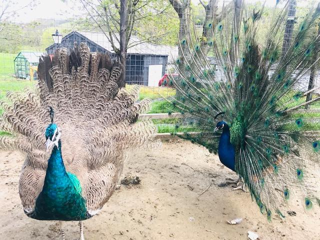 ▲ 成長したオスの子クジャク(左)。父クジャク(右)とともにディスプレイを披露(2021年5月現在)