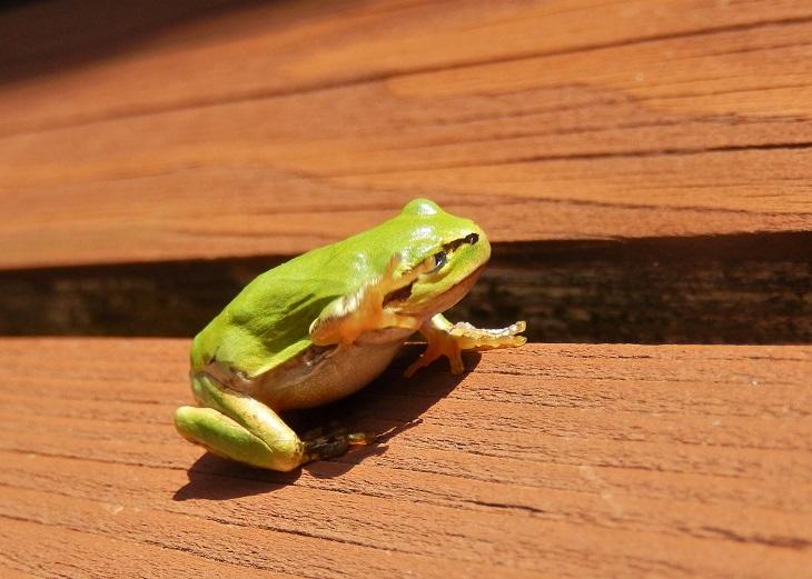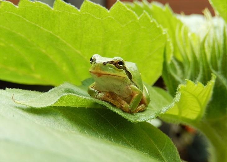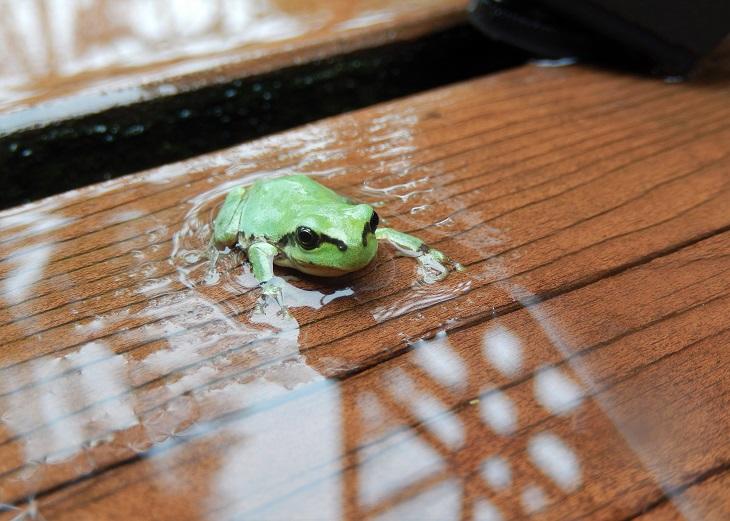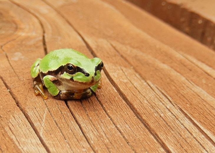 6月くらいには、美しいグリーンのアマガエルが多く見られるようになります。黒いラインが歌舞伎役者の「隈取(くまどり)」のようじゃありませんか。