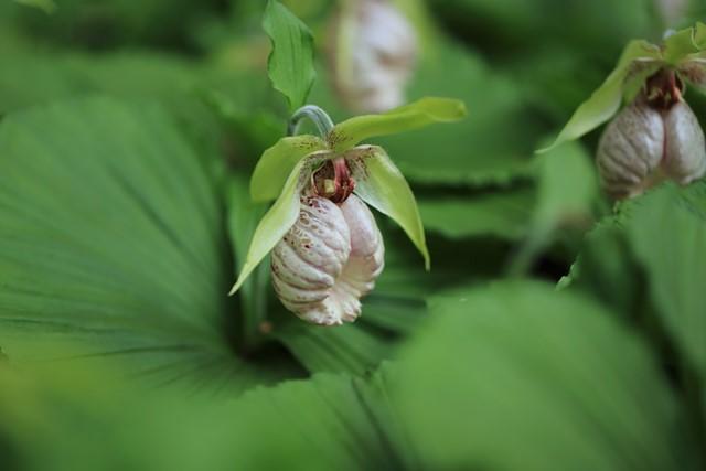杉林の林床に咲き誇るクマガイソウたちの様子です。