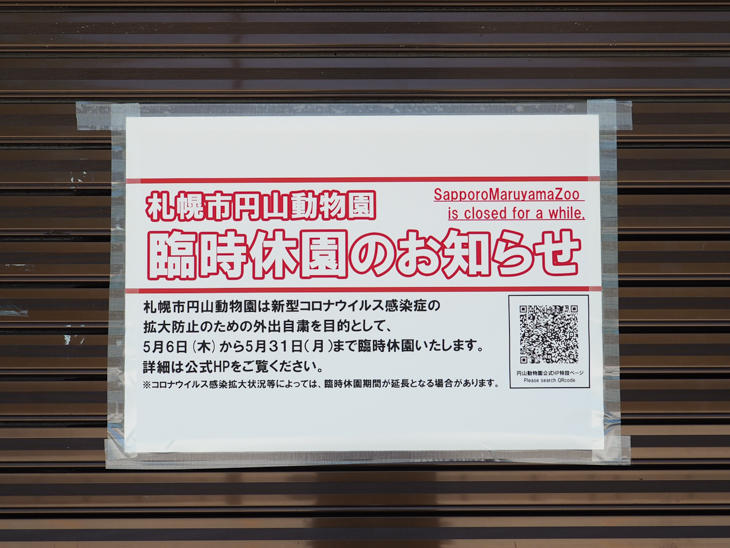 札幌市内では、「札幌市円山動物園」をはじめ多くの市有施設は新型コロナウイルスの感染拡大防止のため、5月31日まで休園・休館しています(札幌芸術の森など一部施設はオープン、2021年5月16日現在)。