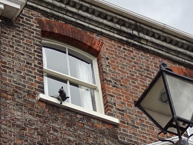 この猫オブジェたち、そもそもの始まりは1920年代。ひとりの遊び心ある地主が、自ら所有する建物の外壁に猫のオブジェを取りつけました。ユーモラスなその姿が話題になり、やがて同様の猫オブジェが増えていったという経緯です。