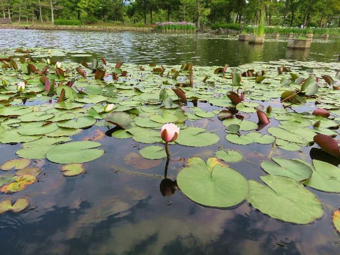 スイレンは、花と葉が水面に浮かんで咲き広がります。あやめ池公園内には、品種4品種400株、白・ピンク・赤・黄の花があって、朝早くから午前中にかけて花を咲かせ、午後から夕方には閉じます。