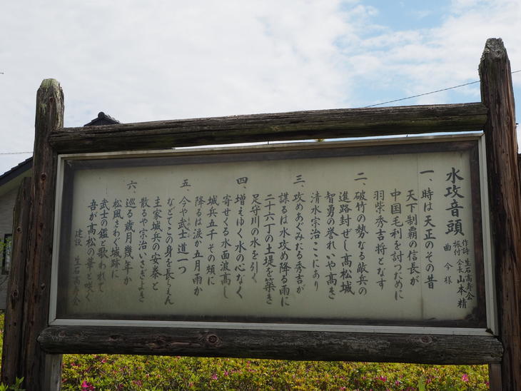 公園の入口には「水攻め音頭」の歌詞が掲げられていました。
